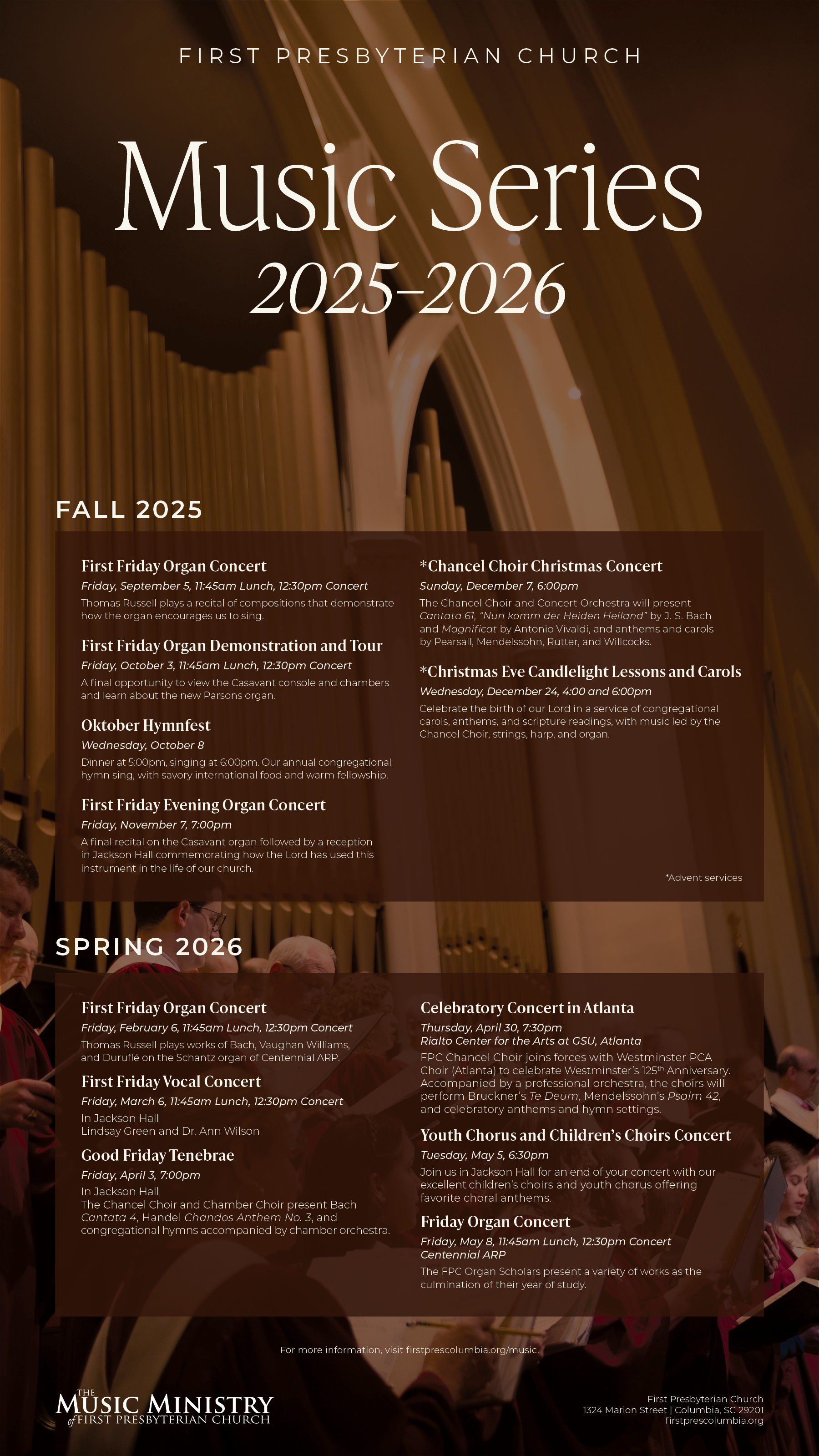 Members of First Presbyterian will present a final recital on the Casavant organ, followed by a reception in Jackson Hall, in an evening where we commemorate how the Lord has used this instrument in the life of our church.